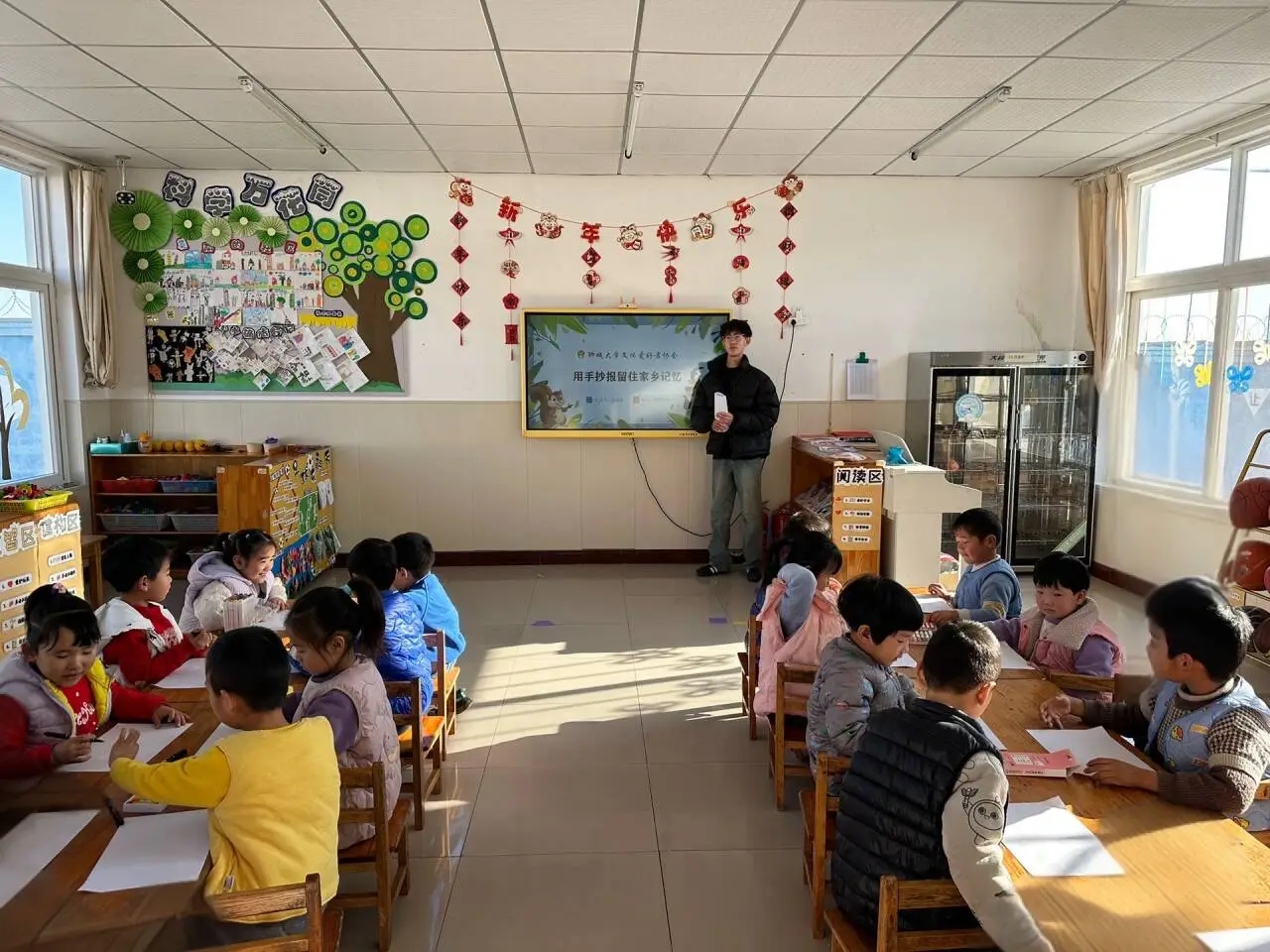 为激发人们对家乡的浓厚情感情感,留存独特记忆,传承地域文化,1月19日至1月20日,太阳成集团tyc33455文体爱好者协会“青春乡韵”文化服务队在烟台市海阳市龙山街道幼儿园、临沂市罗庄区童星幼儿园举办“用手抄报留住家乡记忆”制作手抄报活动。