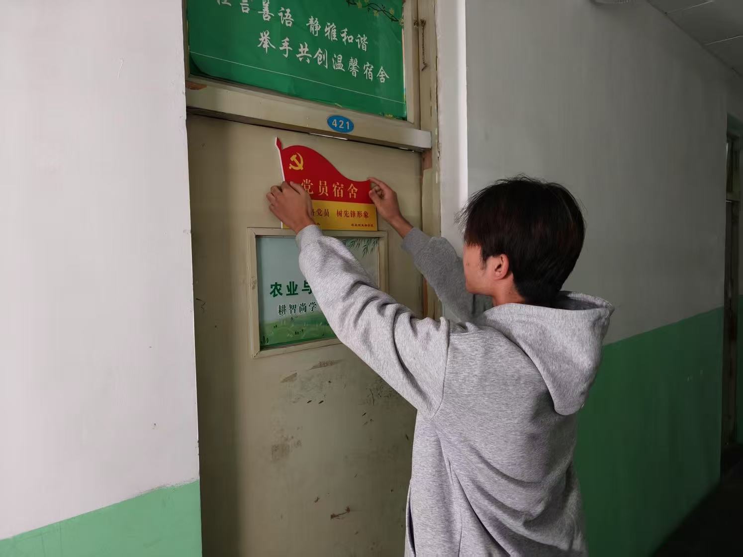 挂牌仪式正式开始,学生党员们庄重地将“党员宿舍〞标识牌悬挂在宿舍门上。这一方小小的牌子,不仅是党员身份的公开宣告,更是对党员在宿舍管理中发挥带头作用的督促。它时刻提醒觉员要自我约束、自我提升,主动承担起维护宿舍秩序、促进宿舍和谐的责任。