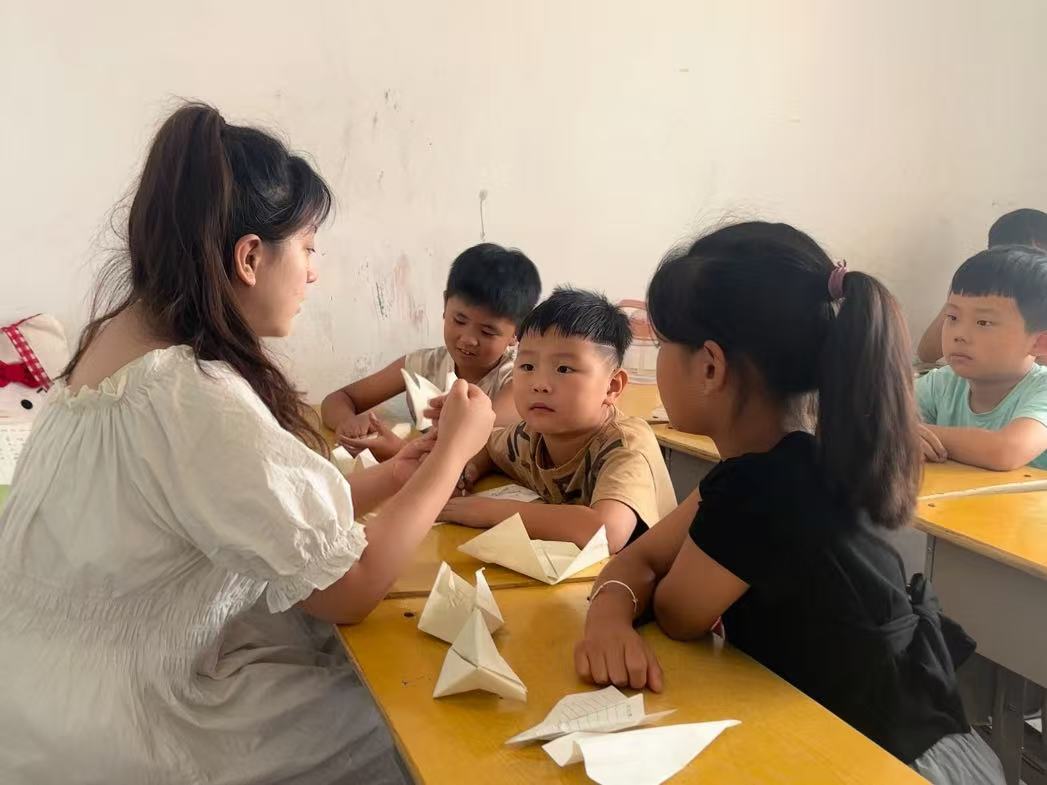 课业辅导结束后,兴趣课堂成为孩子们的欢乐天地。绘画课上,队员们分发彩笔与画纸,鼓励孩子们用色彩描绘心中的乡村与梦想;编织绳活动中,队员们手把手教学,从基础结法到创意造型,孩子们的小手上渐渐出现了五彩的手链、小巧的挂饰;折纸课堂里,一张张普通的彩纸在队员们的示范下变成千纸鹤、小船、青蛙,孩子们举着自己的作品相互展示,队员们用陪伴拉近与孩子们的距离,让他们感受到久违的温暖。