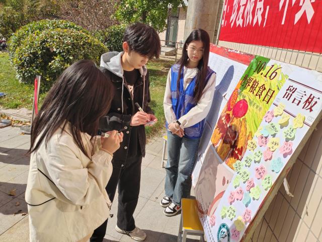 在活动现场,志愿者们精心布置了醒目的标语。“珍爱粮食,不负‘食’光”的醒目文字,搭配着倡导健康饮食和节约粮食的宣传画,显得格外引人注目,吸引了众多同学驻足观看。