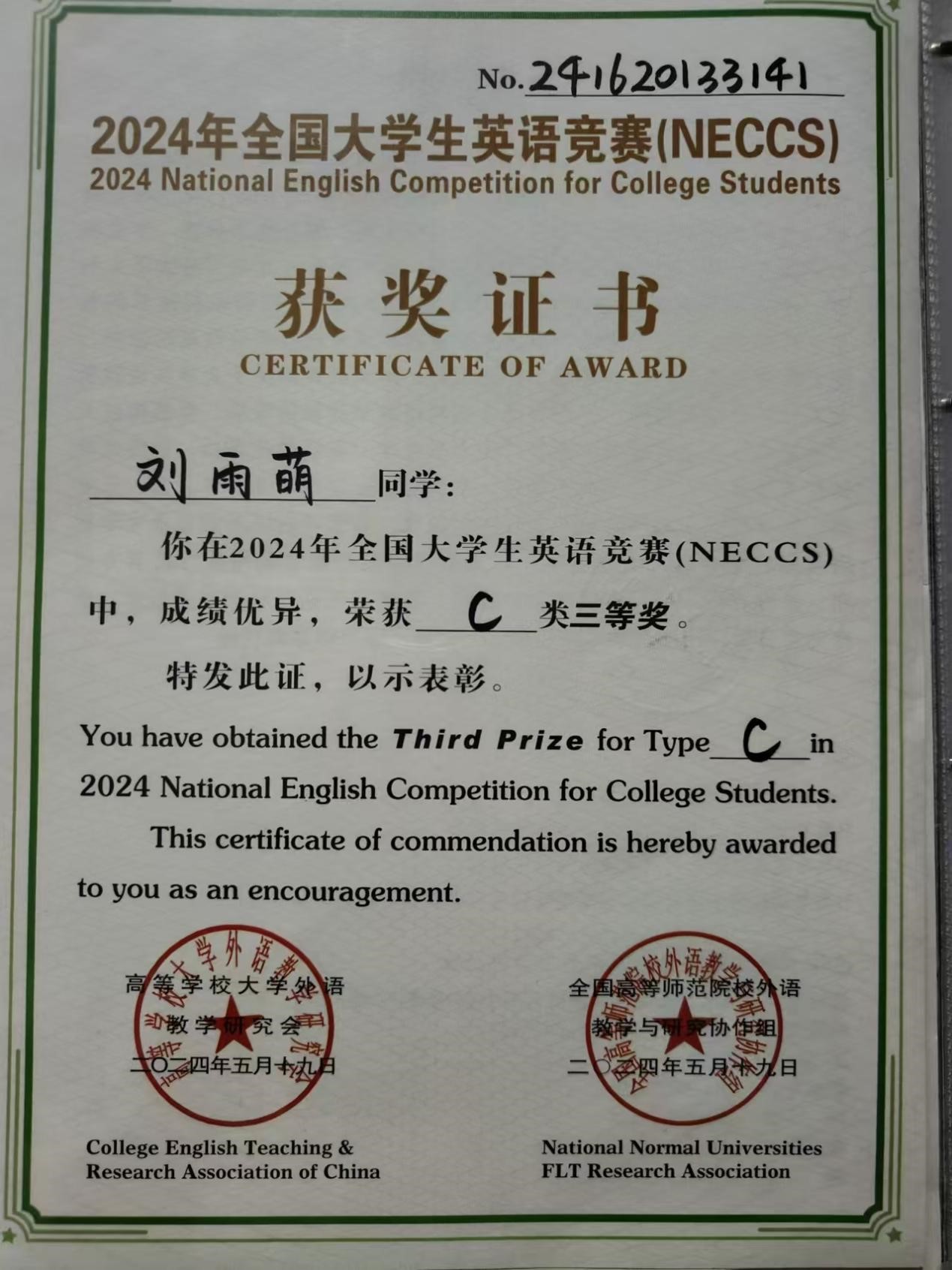 我院刘雨萌同学在2024年全国大学生英语竞赛(NECCS)中,成绩优异,荣获C类三等奖,对该获奖同学予以祝贺表彰。