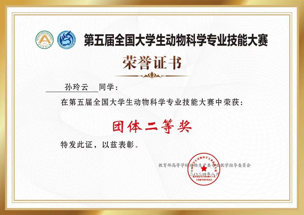我院孙玲云同学在第五届全国大学生动物科学专业技能大赛中荣获二等奖,对该获奖同学予以祝贺表彰。