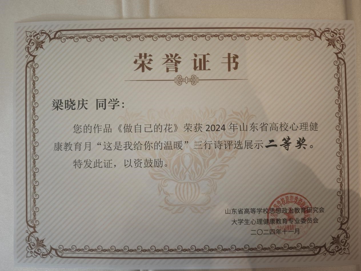 我院梁晓庆同学在2024年山东省高校心理健康教育月“这是我给你的温暖”三行评选展示荣获二等奖,对该获奖同学予以祝贺表彰。