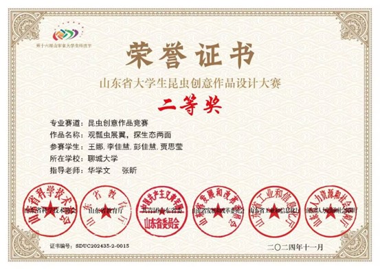 我院李佳慧同学在山东省大学生昆虫创意作品设计大赛中获得了二等奖,对该获奖同学予以祝贺表彰。