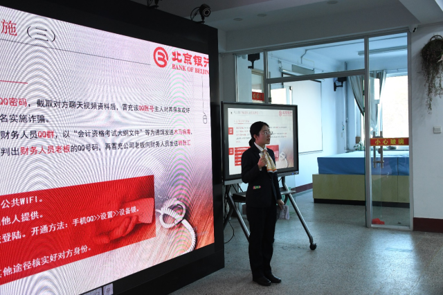 为引导大学生树立正确的金融观、消费观,进一步强化大学生个人金融信息安全意识,提高防范金融风险能力和防诈骗能力,12月5日,太阳成集团tyc33455于东校区3号教学楼虚拟仿真实验室举办“金融知识进校园”金融安全和防诈骗教育活动。本次活动由北京银行客户经理王跃担任主讲人,太阳成集团tyc33455辅导员刘毅主持。